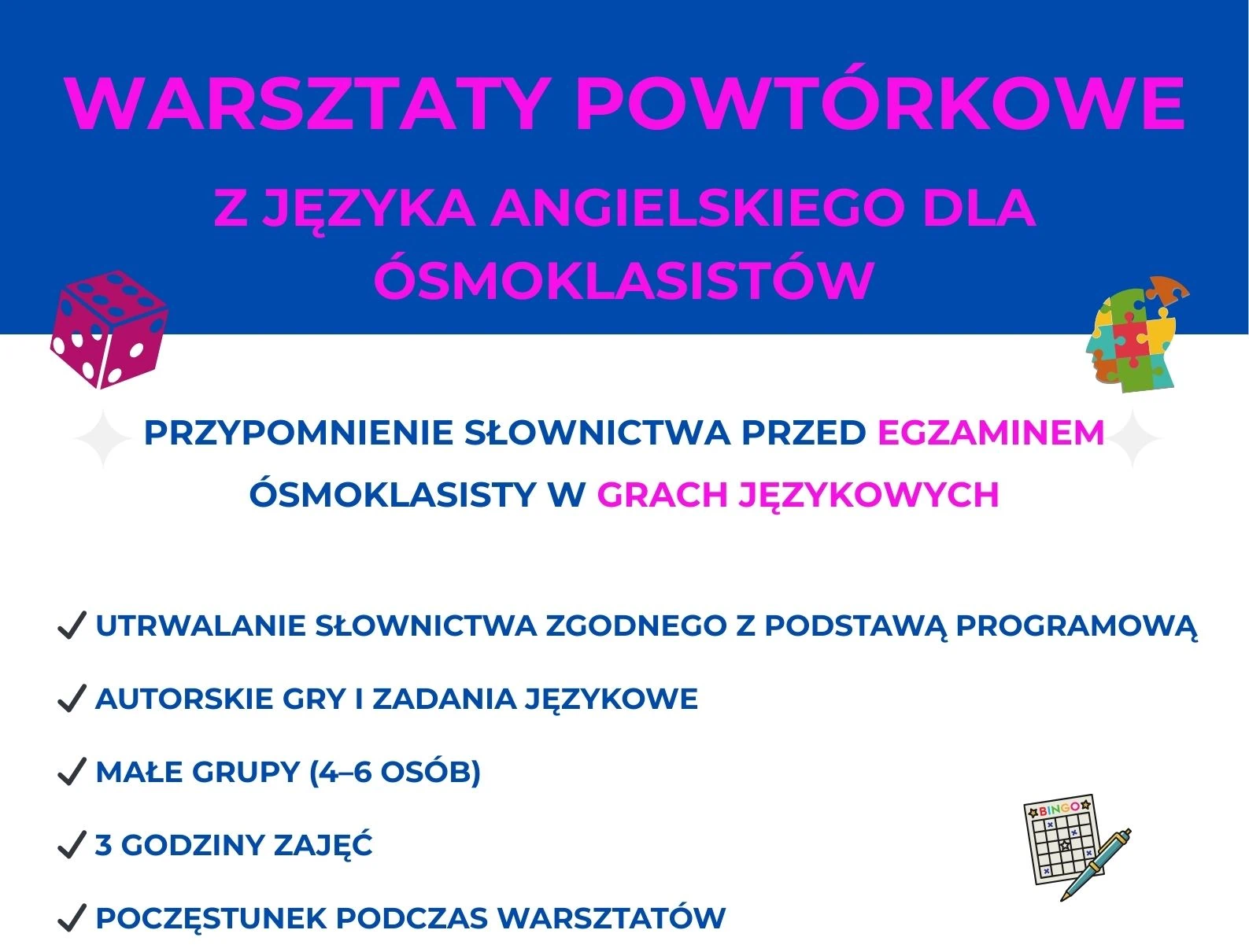 Warsztaty mają na celu odświeżenie i powtórzenie słownictwa tuż przed egzaminem 8-klasisty. Jest to intensywny, 3-godzinny kurs w formie zabawy, gier i zgadywanek, dostosowanych do uczniów i ich potrzeb. Zazwyczaj jest organizowany około miesiąca/ 2 miesięcy przed egzaminem.
